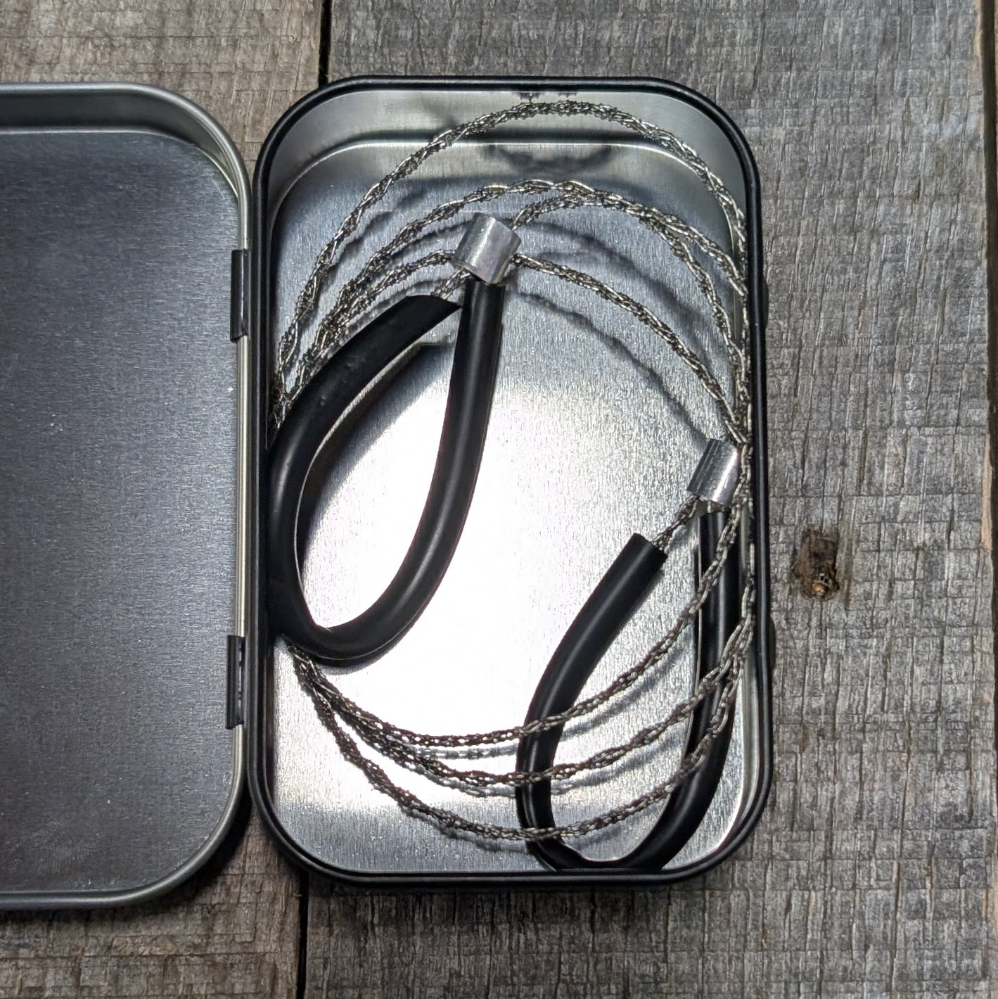 A compact braided wire saw capable of cutting wood, plastic, and soft metals in the field.